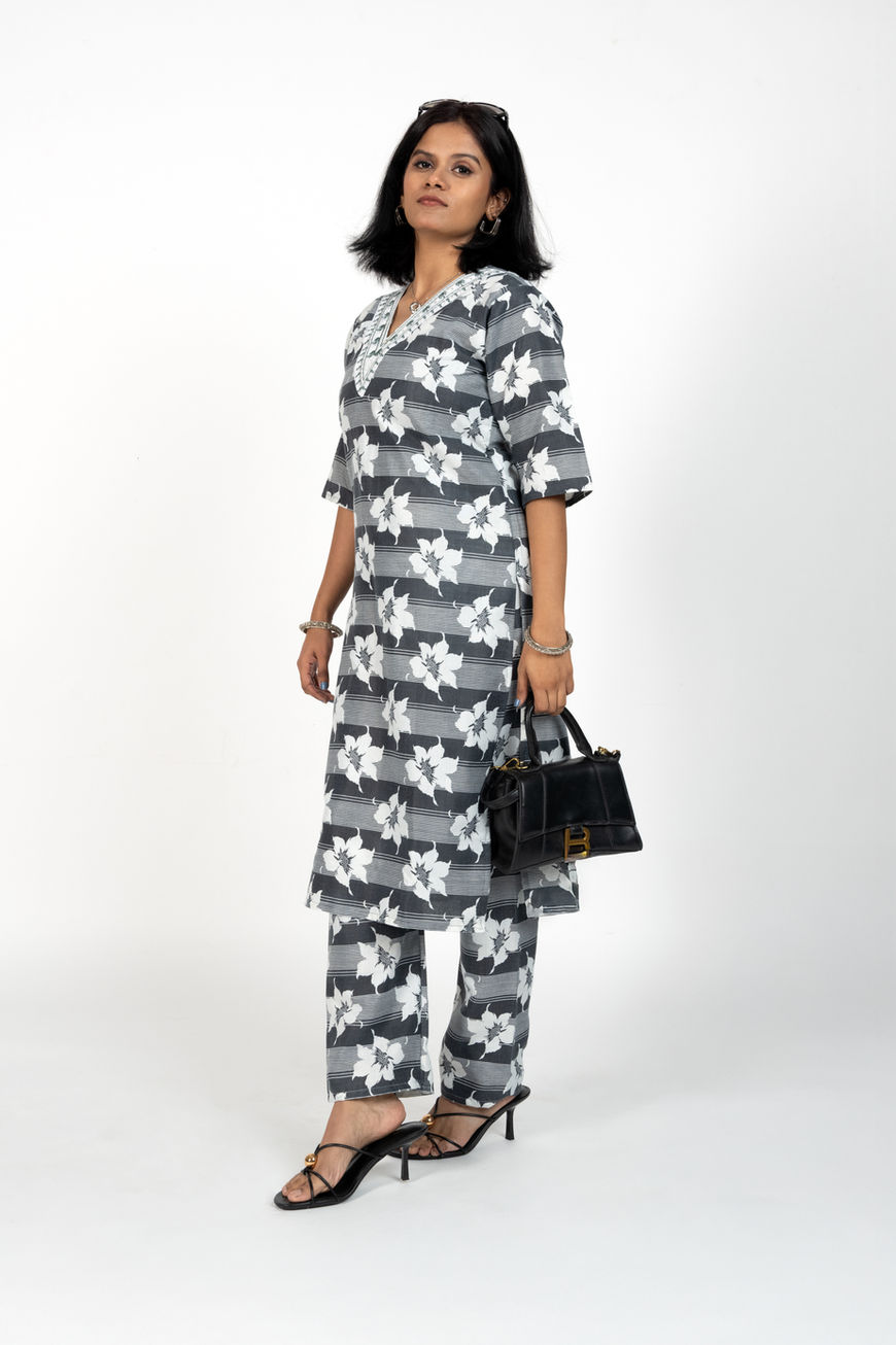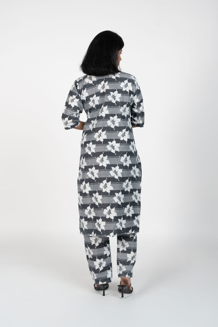 Floral Striped Co-ord Set - Grey & White