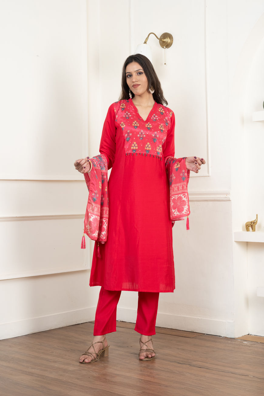 Roman Silk Ghera Suit with Chinon Digital Dupatta - Ruby Red