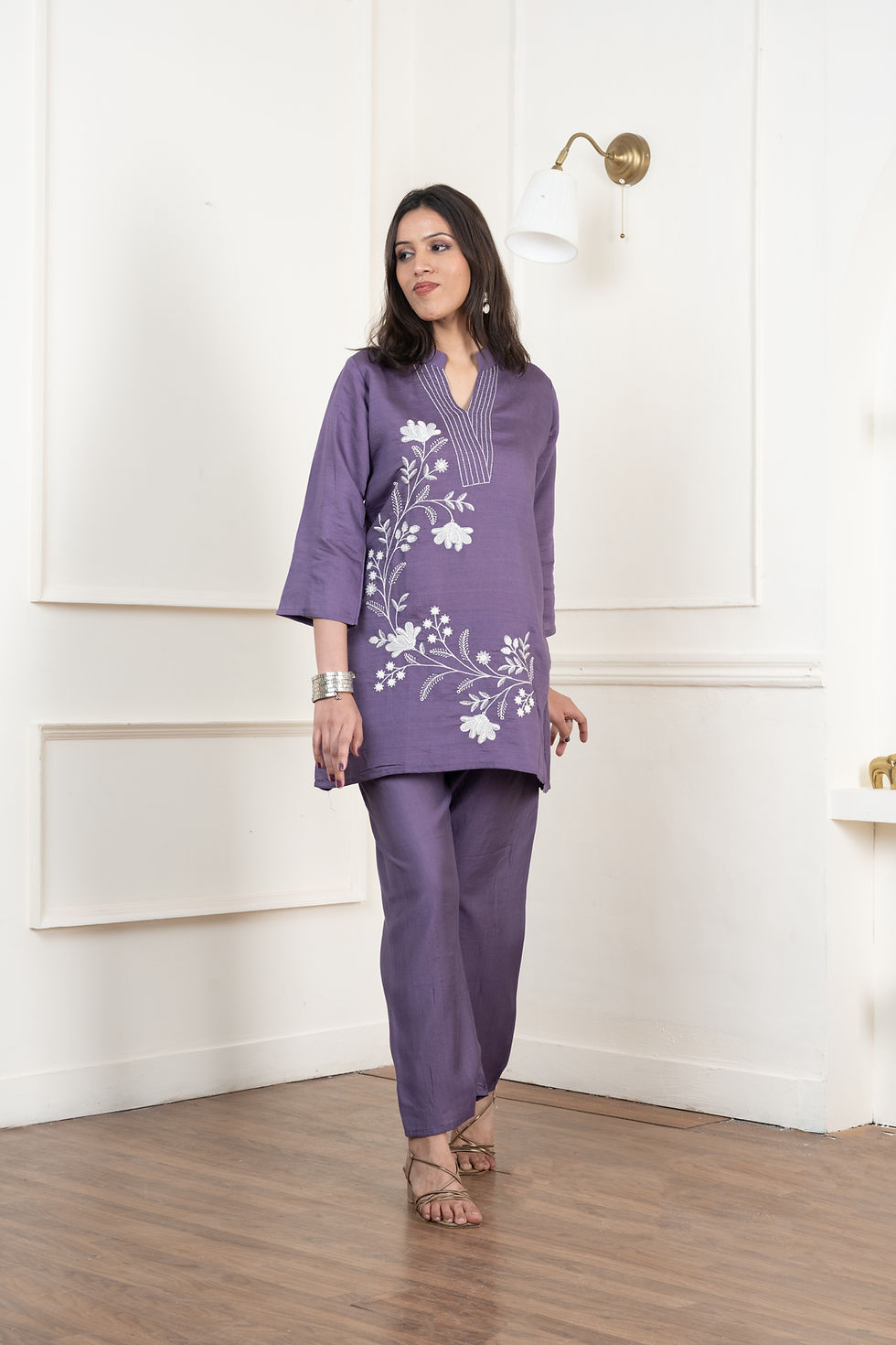 This elegant long kurta features a soft ivory base adorned with hand-painted violet floral motifs and delicate peach vertical strokes. It is styled with contrasting black leggings for a modern, minimalist look.The design is highlighted by intricate 3D pink and blue floral appliqués and feminine scalloped embroidery on the cuffs and hemline.